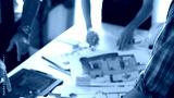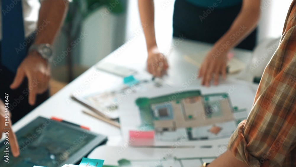 Close up of smart business team hand working together to plan design while looking at project plan from tablet and discussing about blueprint and building construction at meeting table. Alimentation.