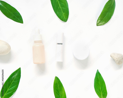 White cream bottle placed, Blank label package for mock up on a green foliage background and flowers. The concept of natural beauty products.