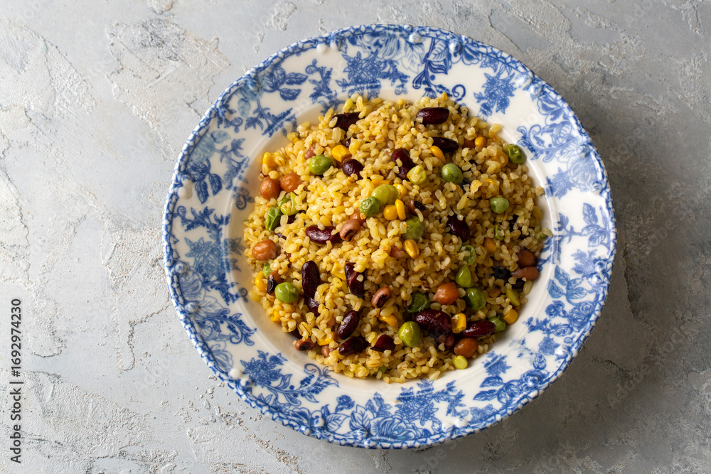Bulgur pilaf with legumes; with peas, beans and corn kernels.