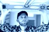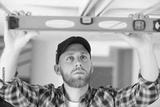 house renovation worker checking the alignment of a ceiling