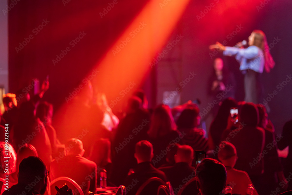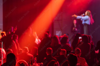 Audience enjoys live performance on stage illuminated by striking red lighting creating dynamic atmosphere