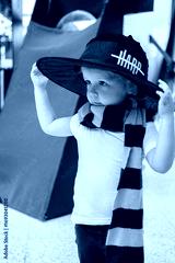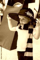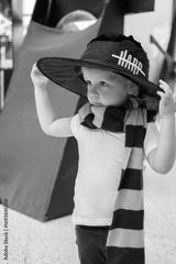 A little girl is wearing a magician's costume featuring a playful hat and scarf. She appears engaged as she enjoys a creative activity in a vibrant environment.