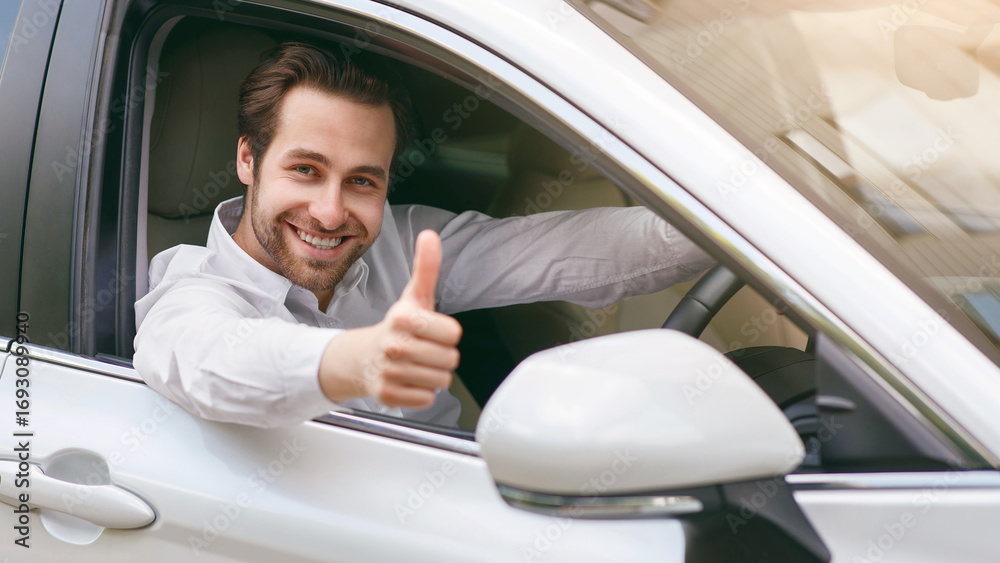 Test drive, great ride, good car, positive mood of businessman driver. Happy glad millennial handsome guy with stubble in white shirt showing thumb up, sitting in white new car, close up, free space