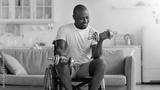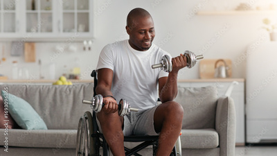 Covid-19, home workout, fit for muscle and recovery. Hard working invalid exercising with weights. African american adult male disabled in wheelchair raises dumbbells in room interior, empty space