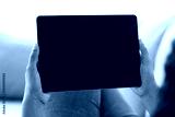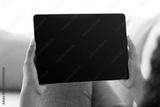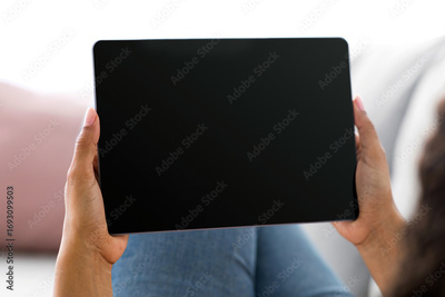Rest and relax at home with modern tech, blog, online call and chat in social networks. Young black woman lying on couch watching online lesson in tablet with blank screen, close up, pov, cropped