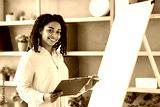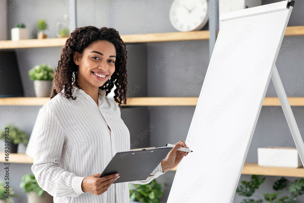 Work and study at home, social distance, education and courses online. Shooting video blog. Smiling cute pretty young african american lady writes at board, holds tablet, teaches at home, free space
