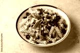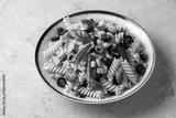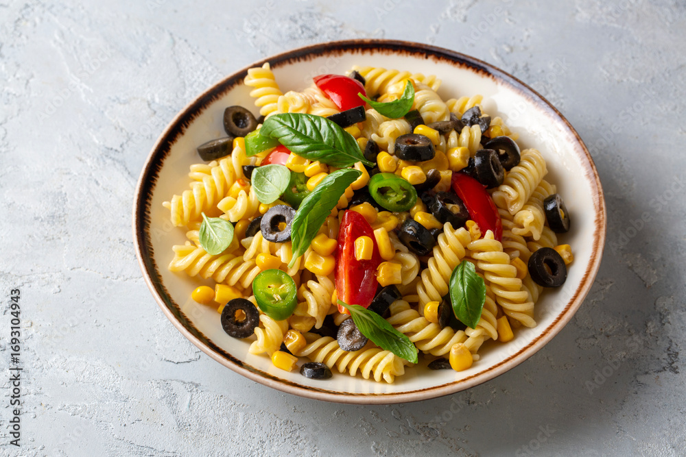 Close-up of fresh homemade colorful vegan fusilli pasta salad on the plate on the table.