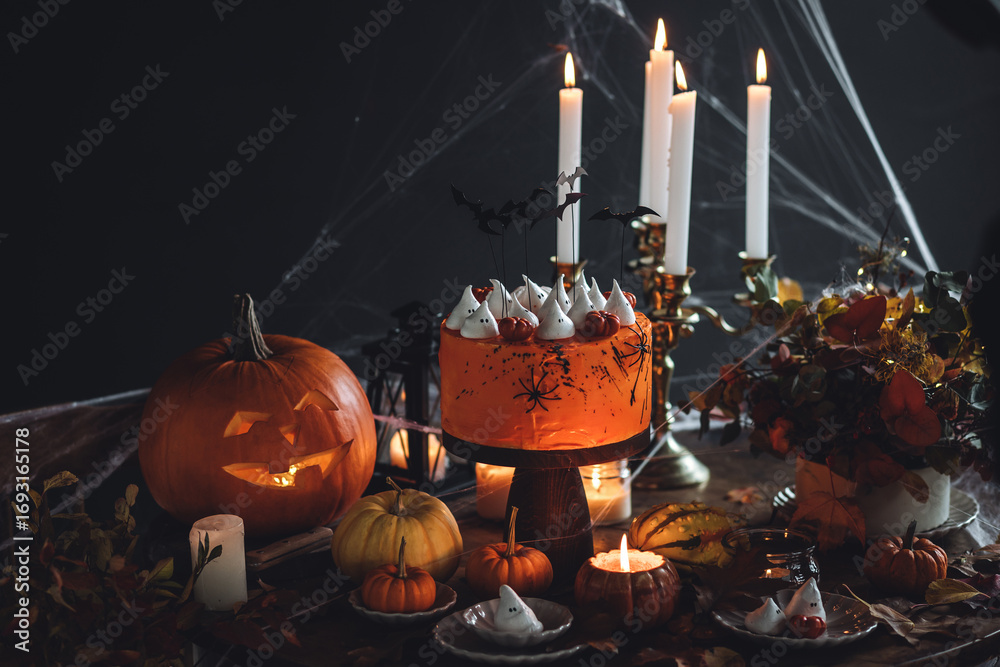 Homemade delicious chocolate cake with coloured orange cream and meringue ghosts, pumpkins for Halloween home party. Elegant beautiful table arrangement with candles, chandelier, Jack-o-Lantern