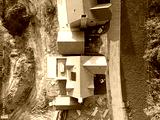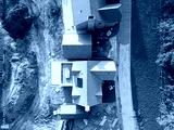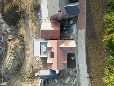 Drone top down view of new completed, detached family homes on a rural British housing development site. The patio area and roof lantern can be seen on the lower house.
