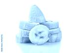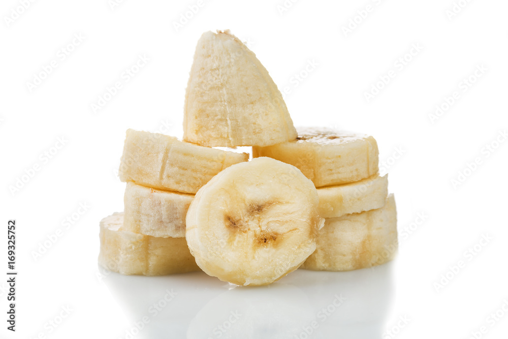 Banana slices cut isolated on white background with reflection.
