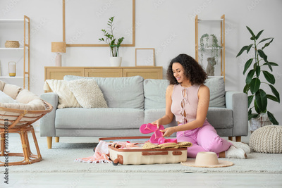 Young African-American woman packing flip-flops into suitcase for trip at home