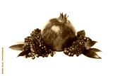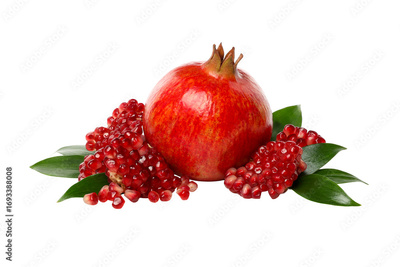 Vibrant pomegranate seeds and lush leaves, isolated, PNG