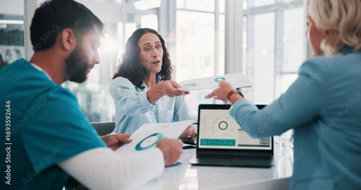 Hospital, meeting and people on laptop with documents for finance report, budget and funding. Healthcare, team and workers with graph, statistics and paperwork for insurance, medical grant or revenue