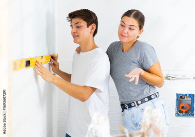 Happy young couple doing repairs in the bathroom uses a spirit level on the wall