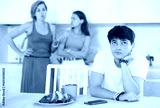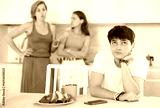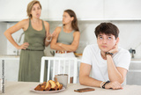 Bored guy is sitting at kitchen table and unwittingly listens to mothers altercation with adult daughter. Young man sits in kitchen and listens to quarrel between woman and young girl, witness to
