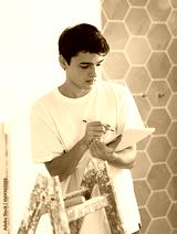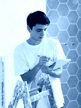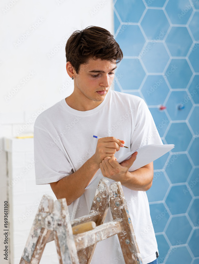 Young creative designer working in apartment under renovation, taking notes on papers while planning interior decoration