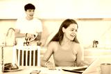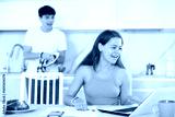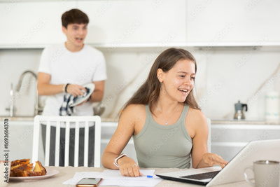 Young smiling guy chatting with young woman working on laptop in kitchen at home