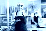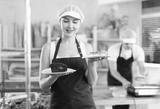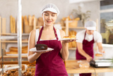 In sales are of bakery store, young woman entrepreneur holds out segment of sponge cake, shows product, and then familiarizes herself with bakerys assortment. She sells fresh cakes and pastries