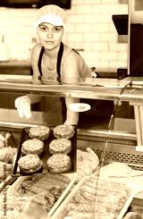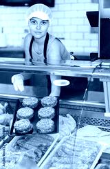 Young woman seller prepared semi-finished minced meat, raw half-finished meat cutlets for sale and placement on showcase. Fresh meat and semi-finished products.