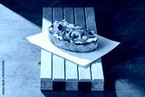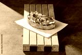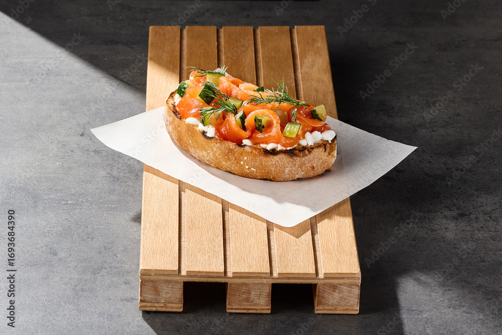 Salmon bruschetta with cream cheese and cucumber, bright mood, overhead composition on wooden board