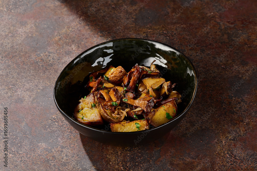 Fried potatoes with chanterelle mushrooms, rustic moody lighting, single bowl closeup composition