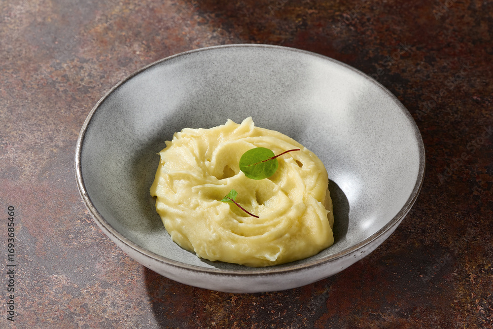 Mashed potatoes in gray ceramic bowl, moody lighting, overhead composition, minimalist garnish