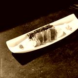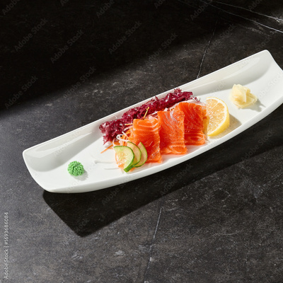 Salmon sashimi on white platter, bright lighting, overhead minimal composition
