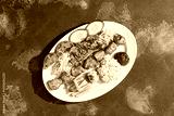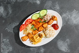 Chicken shashlik platter in bright lighting, overhead with neat ingredient composition