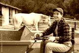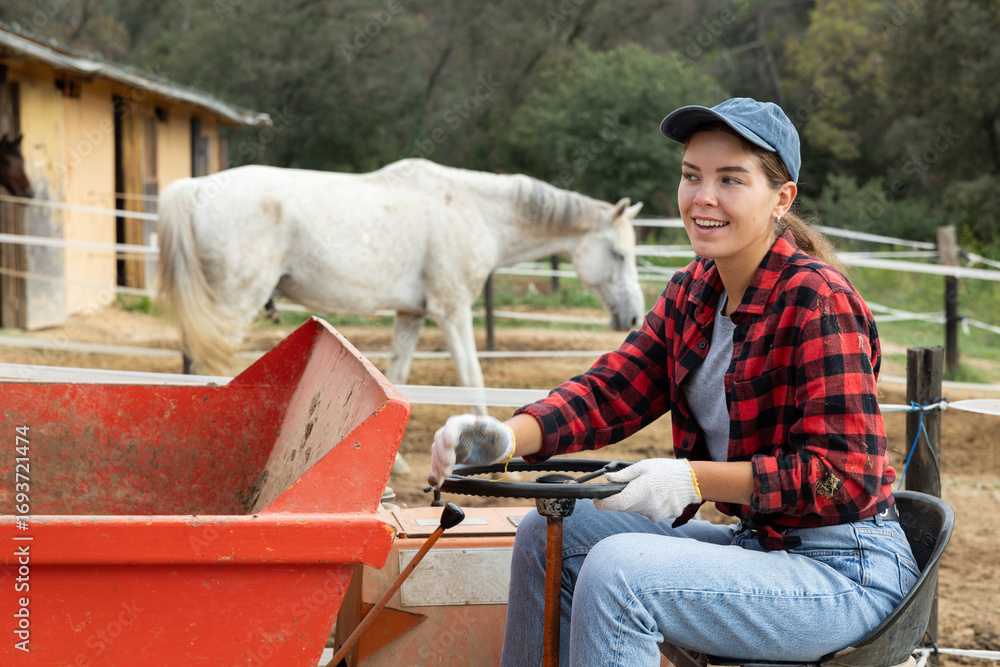 Young girl works on tractor - transporting hay for horses in a stable