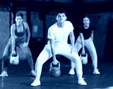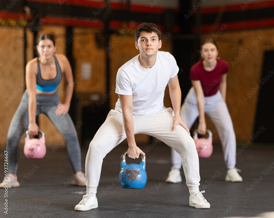Young man in a tracksuit doing functional exercises with a kettlebell. Gym client during a crossfit group workout