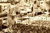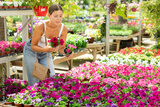 woman visitor of flower boutique examines flowers of red petunia