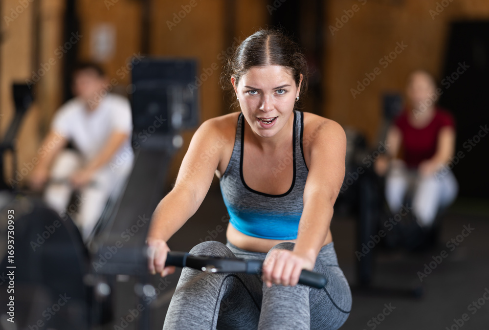 Athletic woman in top and leggings training intensively on rowing machine in Crossfit gym. European adheres to a healthy lifestyle and creates her figure in functional training
