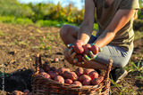 Woman farmer harvests potatoes in a wicker basket. Harvest