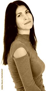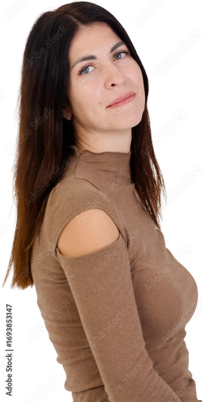 Attractive woman with long dark hair and striking blue eyes, wearing a fashionable brown top with shoulder cutouts, offers a natural, soft smile. Ideal for beauty, lifestyle, or modern fashion themes.