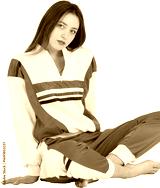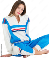 Young woman in retro white and blue tracksuit with red stripes sitting on a transparent background. Studio shot of stylish casual sportswear.