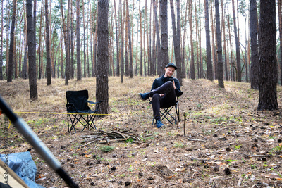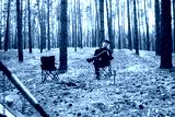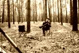 Happy man relaxes in a camping chair in a serene pine forest, enjoying nature's peace. Ideal for themes of travel, adventure, and outdoor escapes.