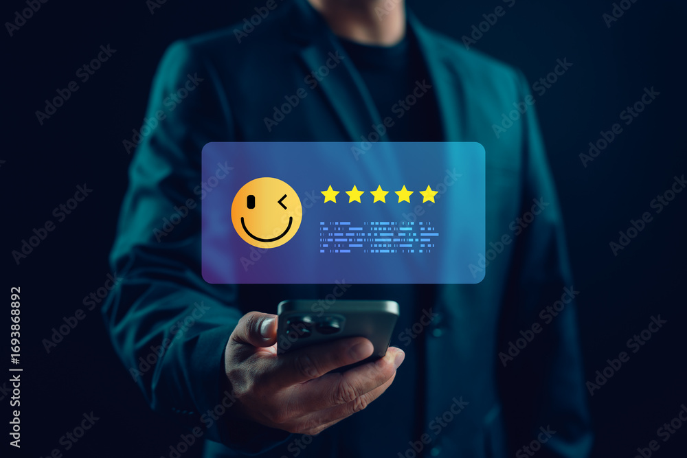 Customer showing five-star feedback on mobile phone with smiley face emoji, representing high satisfaction, positive user experience and quality service review.