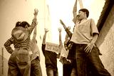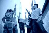 Group Of Young People Raising Hands In The Air Celebrating Or Cheering At Protest