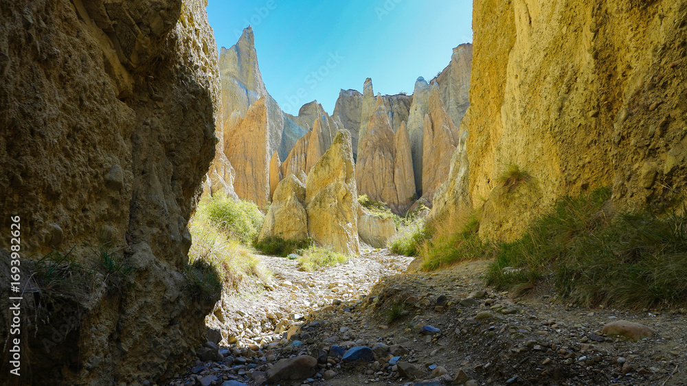 Omarama Clay Cliffs, Omarama, Mackenzie Basin, South Island New Zealand.Majestic rock formations rise above a dry riverbed in a stunning canyon during midday sunlight