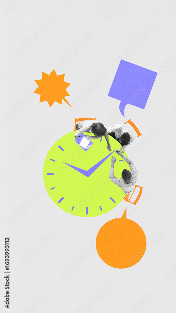 People sitting around green clock table with speech bubbles in surreal business collage. Concept of teamwork, time management, deadlines, planning, communication and productivity.