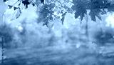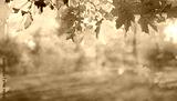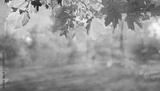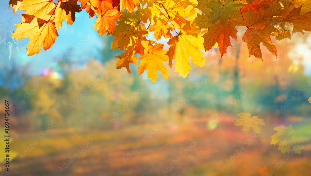 yellow fall leaves in forest, autumn natural field background with blurred bokeh and sun rays