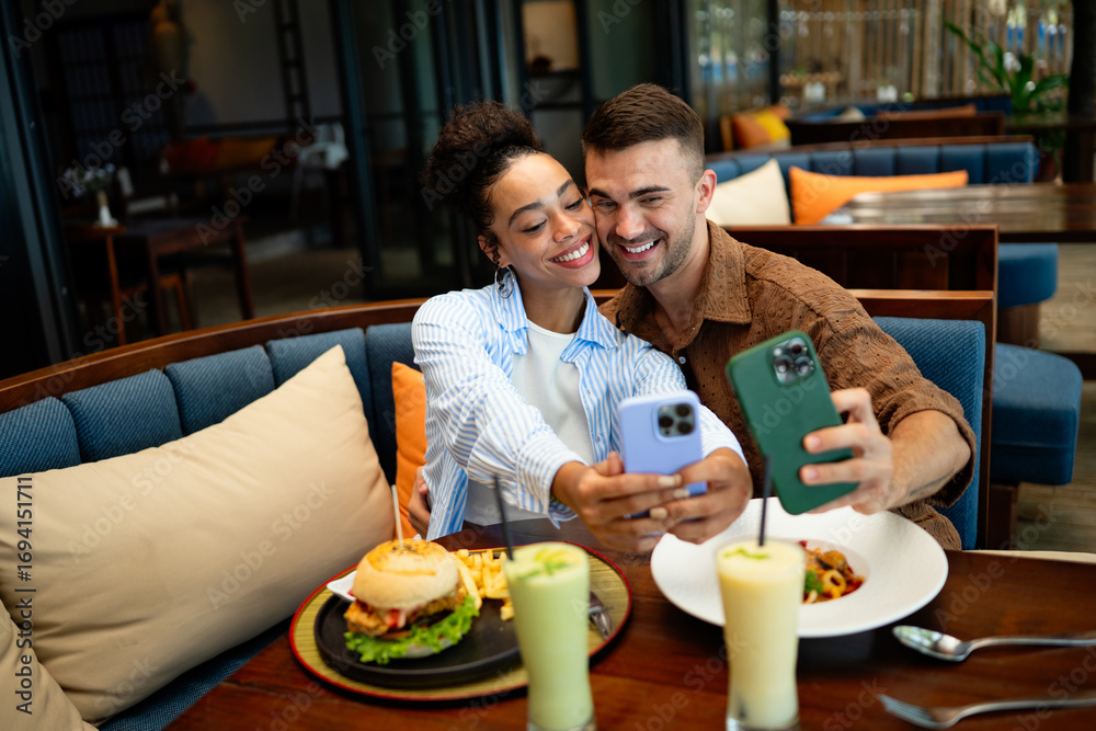 Young couple sharing dining experience at tropical restaurant, engaging with their online followers