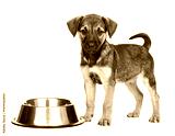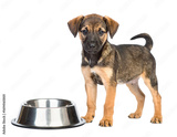 Small Indian stray puppy standing next to an empty stainless-steel bowl PNG