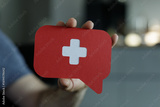 Person holding a red speech bubble with a white cross, symbolizing medical help or healthcare.