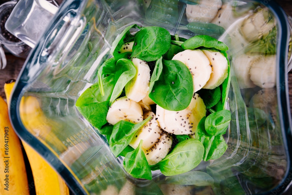 ingredients for green detox smoothies: spinach, bananas, chia seeds