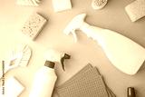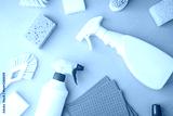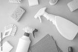 Cleaning supplies, sponges and brushes scattered on green background for household chores and tidy up
