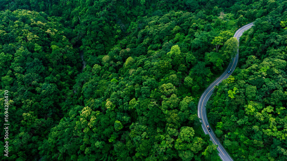 Top view road in beautiful autumn forest at sunset, trees with red and orange leaves , Beautiful landscape view from flying drone in Nature
