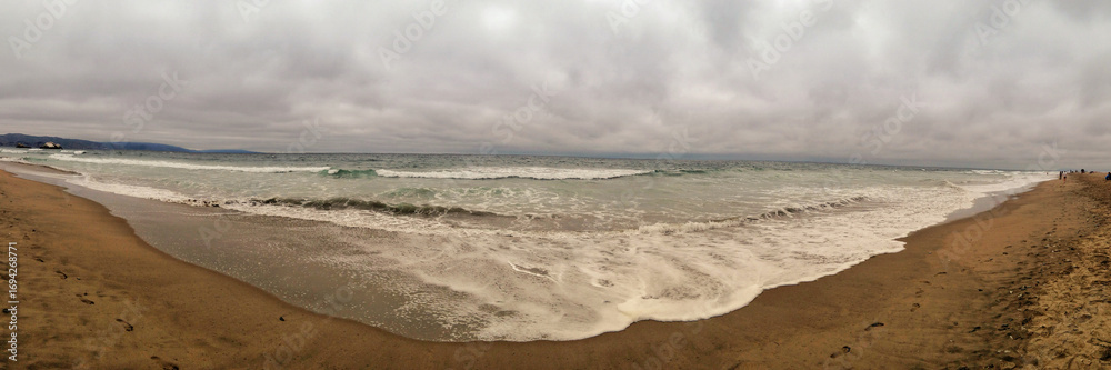 Panoramic view of a sandy coastline with waves under a cloudy sky