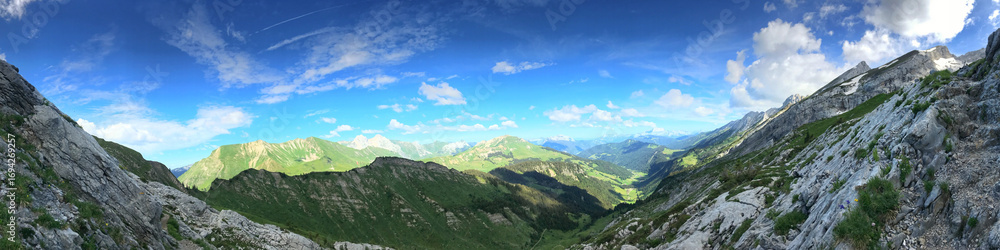 Panoramic mountain view with clear blue skies and rugged rocky terrain