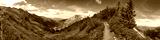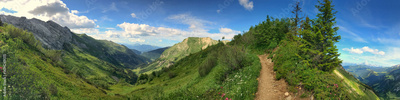 Panoramic view of a mountain landscape with blue sky and green vegetation